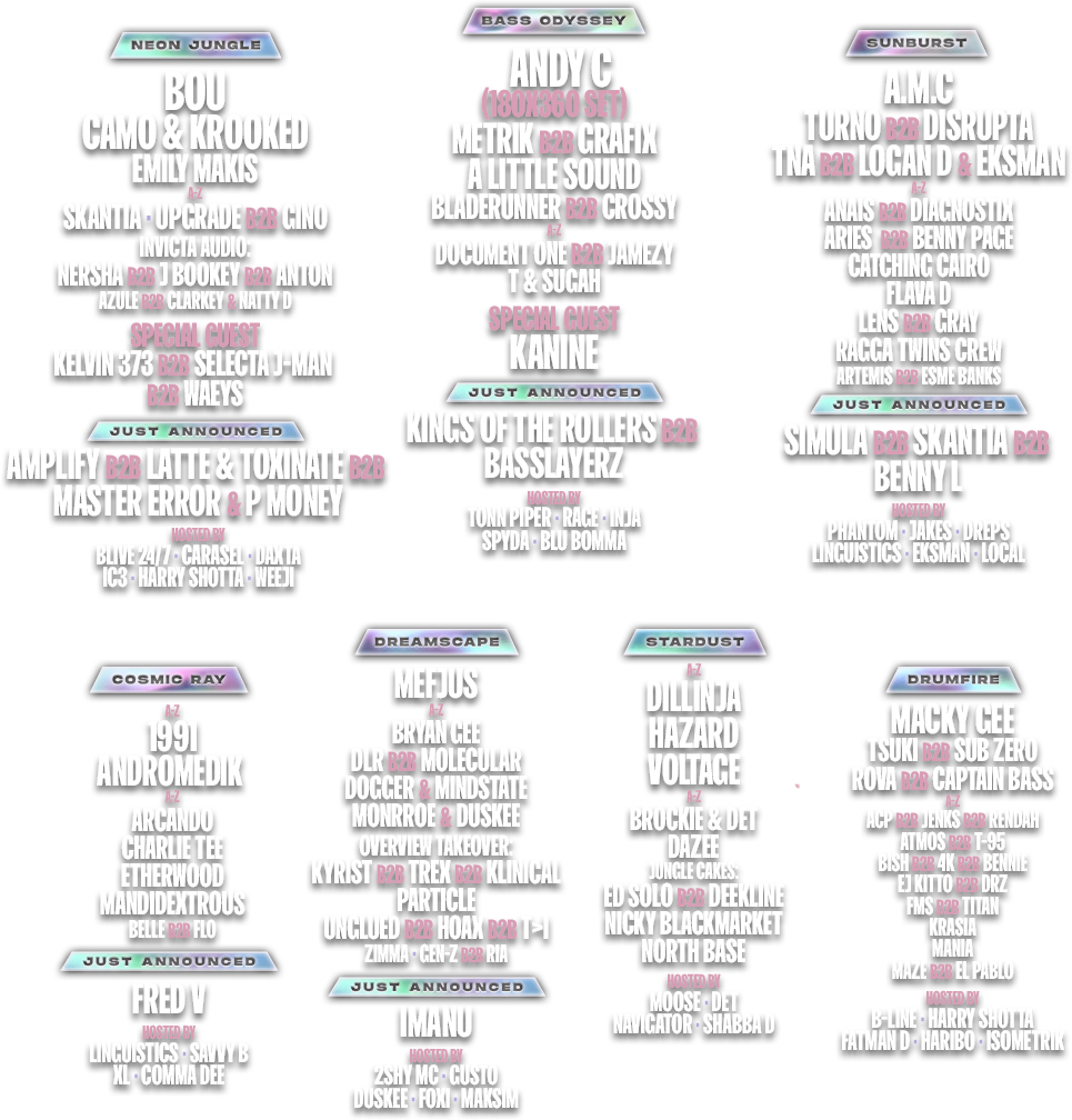 Event lineup poster organised within there stages Bass Odyssey, Neon Jungle,  Sunburst, Dreamscape, Stardust, Cosmic Ray, and Drumfire, with event details and guest hosts.